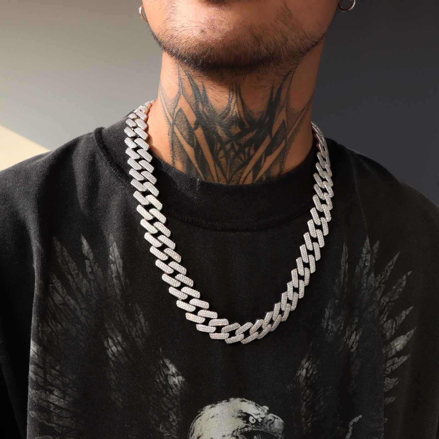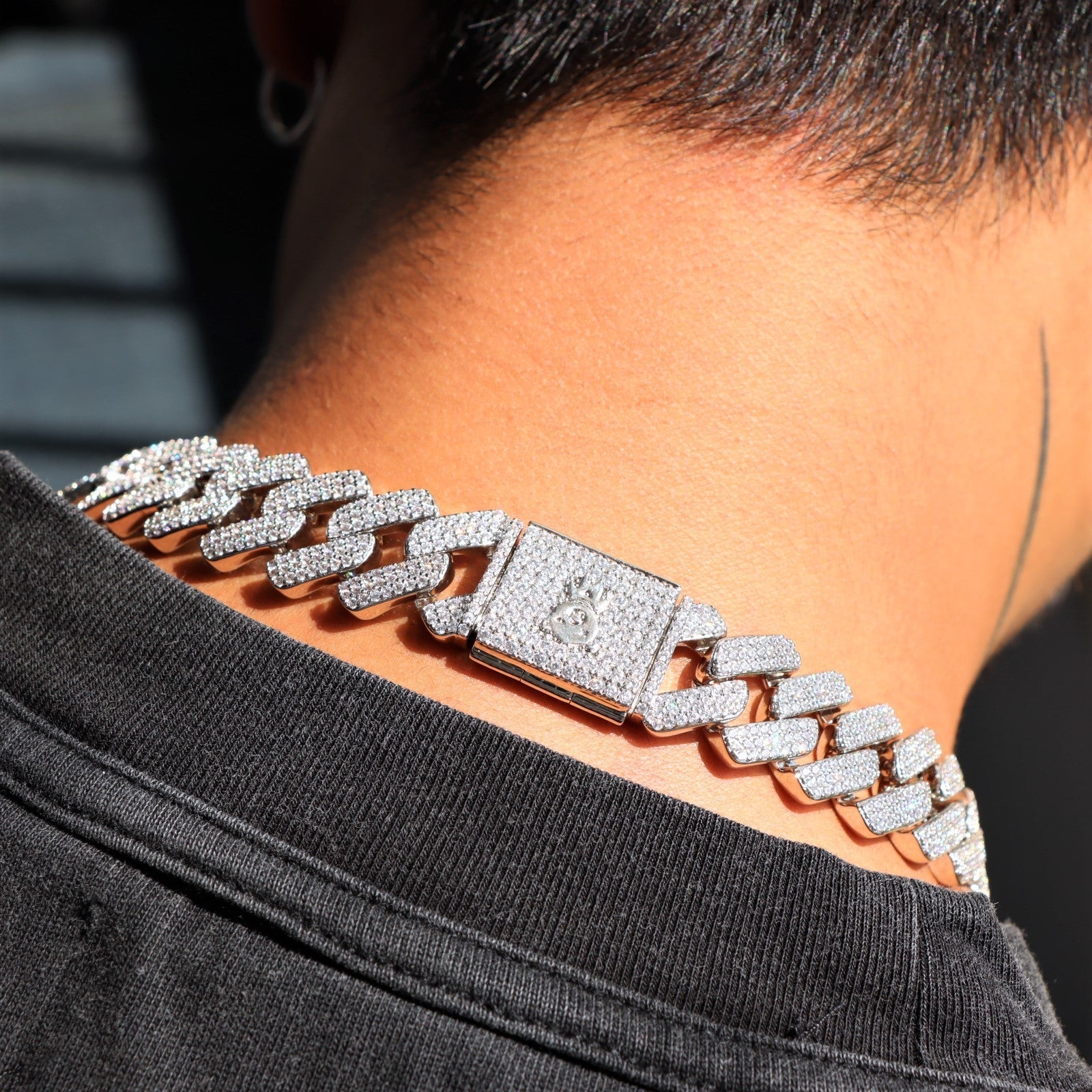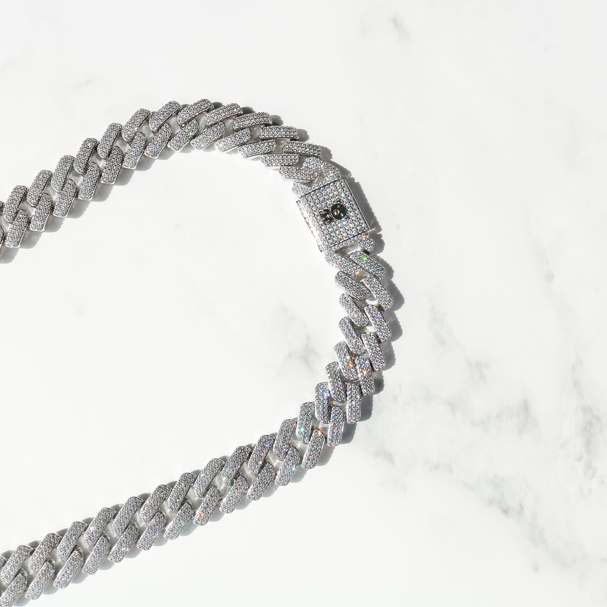 Introducing the 19mm Diamond Prong Monaco Chain in White Gold. This exquisite piece of jewelry is the perfect way to add a touch of luxury to your everyday look. The chain is made of white gold and features dazzling diamonds that are sure to make a statement. The 19mm Diamond Prong Monaco Chain is the perfect way to add a bit of sparkle to your outfit, whether you're dressing up for a special occasion or simply adding a touch of glamour to your everyday style. This chain is also a great gift for that special someone in your life. Order yours today and add a little luxury to your life.