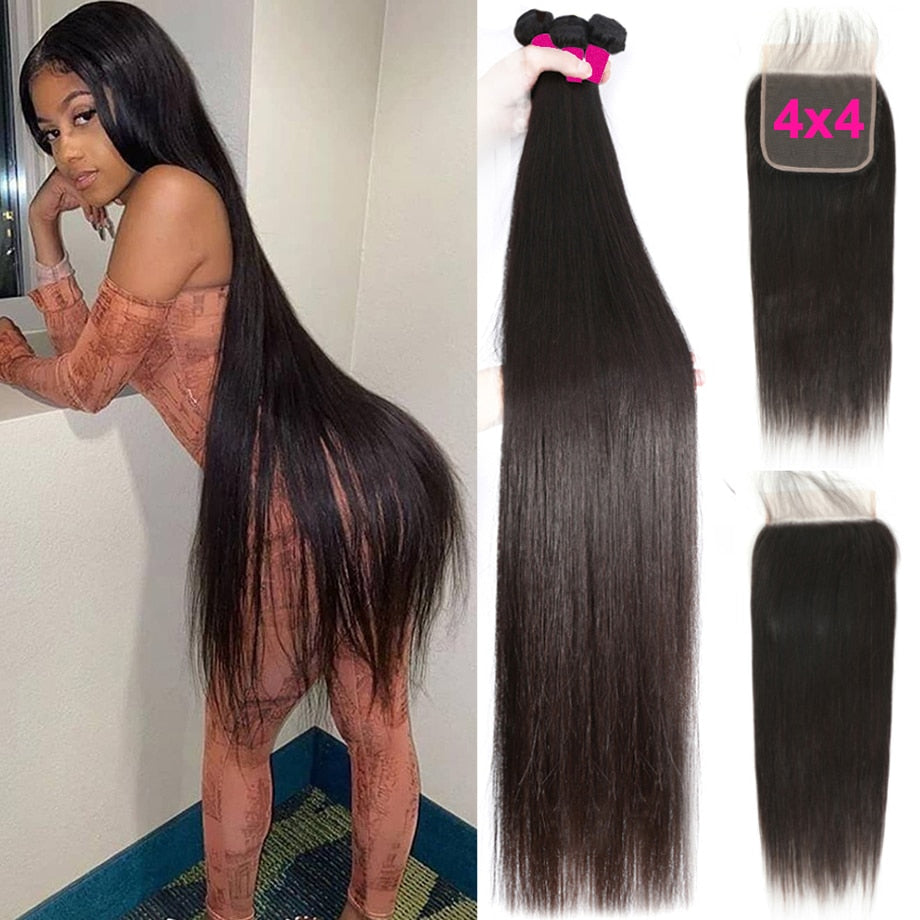 Bone Straight Hair 3 Bundles With Closure 30 Inch Brazilian Human Hair Wave For Black Women Bundles And A Closure Hair Extension