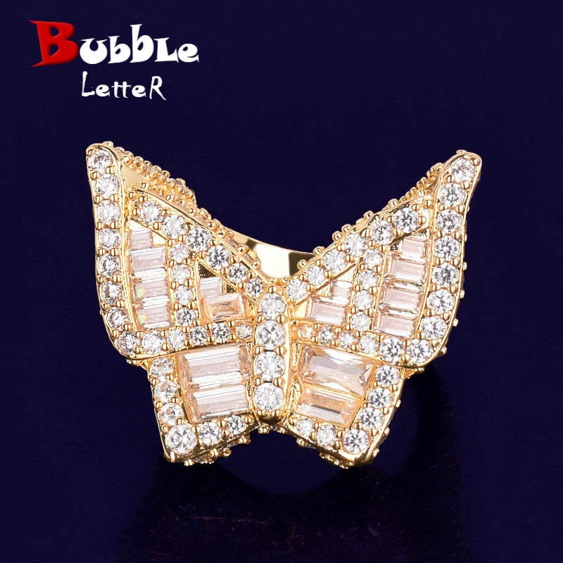 Bubble Letter Butterfly Rings for Women Iced Out Real Gold Plated Hip Hop Jewelry 2022 Trend