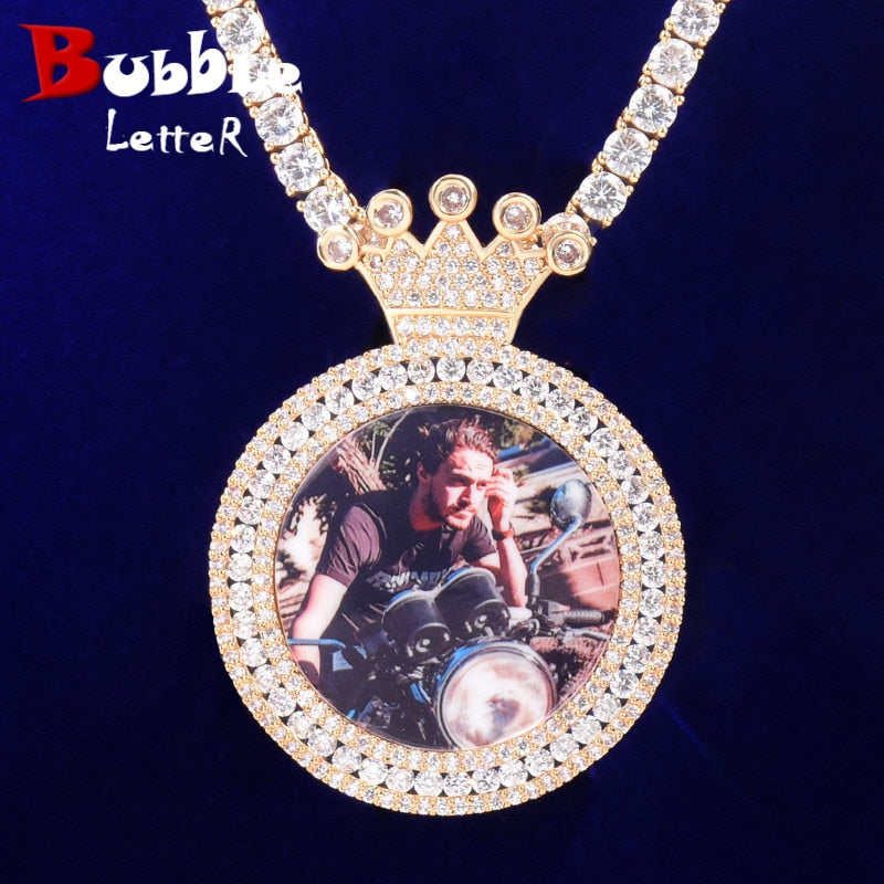 Bubble Letter Custom Photo Necklace for Men Picture Memory Crown Micro Pave Charms Gold Color Plated Hip Hop Rock Jewelry