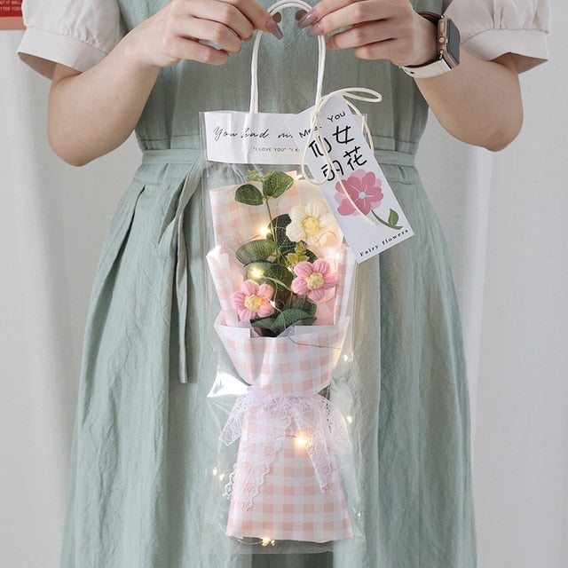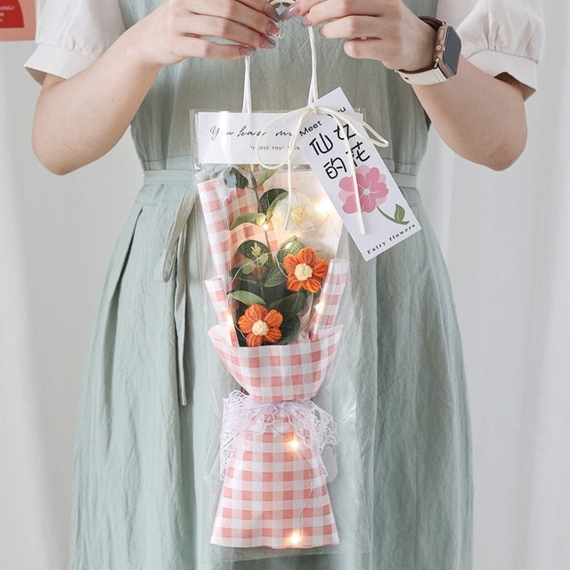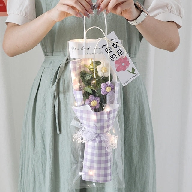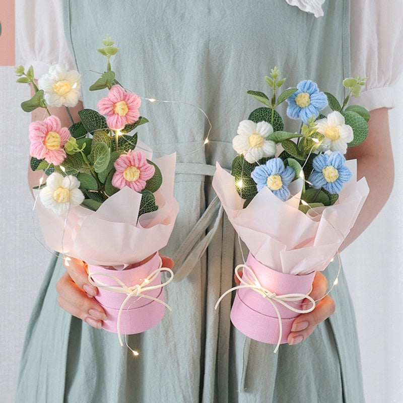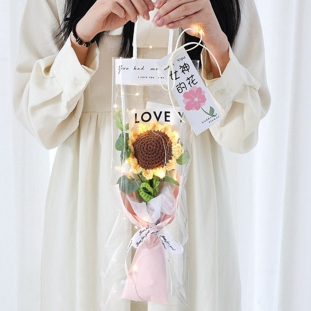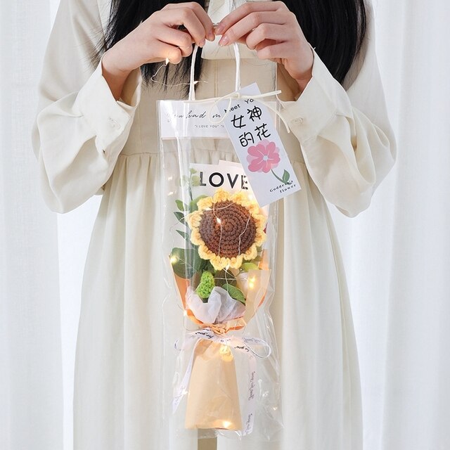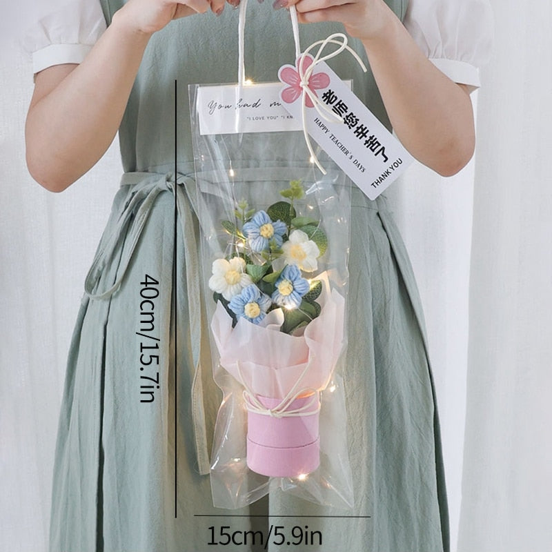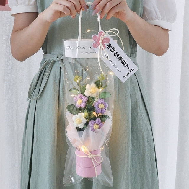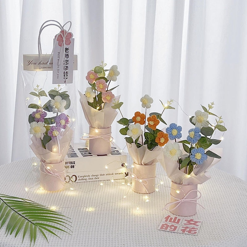 Add a touch of vibrancy to any space with this hand-knitted Colorful Crochet Flowers Bouquet. Made of milk cotton, cloth, and PVC with a string of LED lights, this bouquet gives life to any room or special event. With exquisite workmanship that holds up to time, you won't be disappointed in its quality. Its design includes a cylindrical paper support at the bottom to hold either a single, large flower or an entire bouquet for special occasions like weddings or parties. It also makes for great decorations in bedrooms, dorms, and office desks; not only adding life but making for a unique gift for friends and family. Whether you’re looking for the perfect home decor piece or a way to add pizazz to your next event, the Colorful Crochet Flowers Hand-Knitted Bouquet is sure to give your interior spaces lasting beauty.