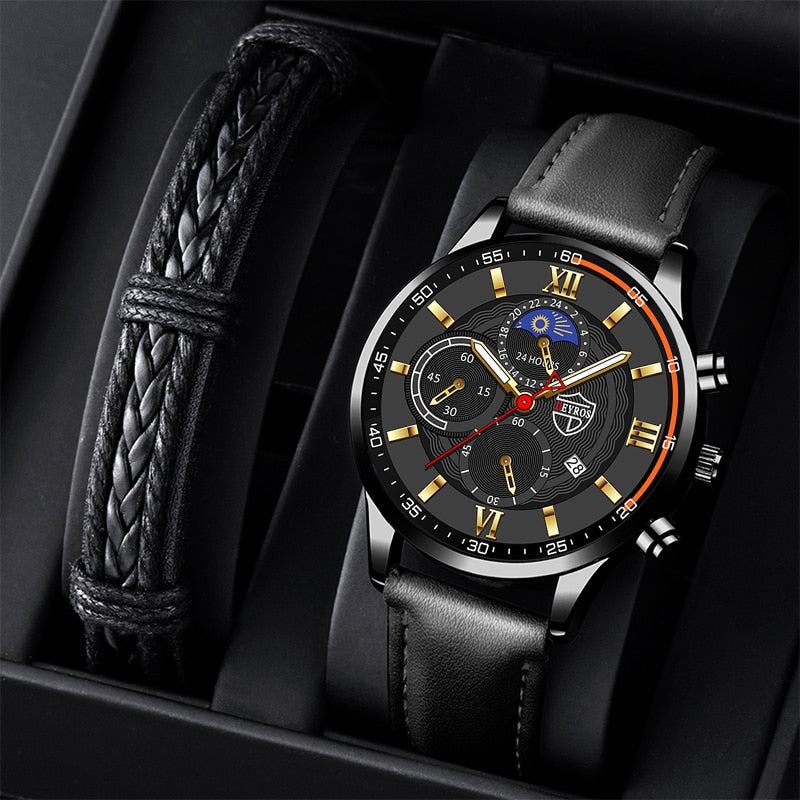Time to elevate your wrist game. Meet the Men's Casual Leather Watch, a sophisticated timepiece that's equal parts stylish and strong. Made with a stainless steel case, military grade strap, and scratch-resistant mineral glass, this watch was built to last. The leather strap is soft and comfortable, yet sturdy enough to stand up to everyday wear. And the luminous hands make it easy to tell time, even in low light conditions. Whether you're at the office or out on the town, this watch makes a statement. Classy, handsome, and built to last, the Men's Casual Leather Watch is an essential addition to any wardrobe. So go ahead and make the time for something special.