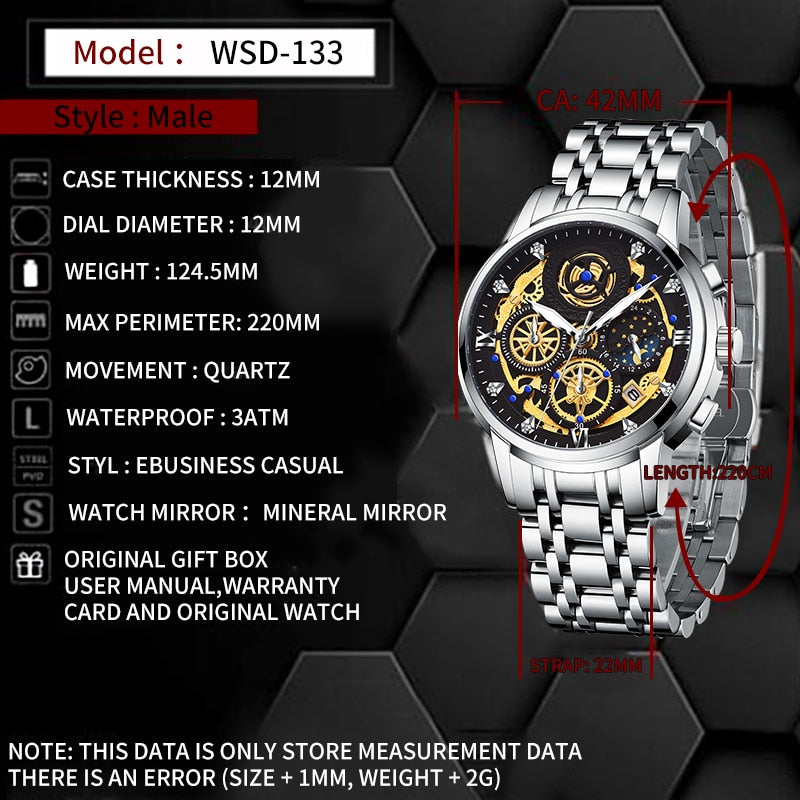 Main features: 【Dial diameter: 42 mm】【Case thickness: 12 mm】【Watch length: 220 mm】【Bandwidth: 22 mm】【Table weight: 124.5 grams】 Movement: Time Module quartz movement (made in China), precise travel, 2 years of service life -3ATM / 30M waterproof (supports cold shower and swimming, does not operate the clock underwater, does not support hot water); -stainless steel (Don’t worry about rust or fading) (Don’t worry that the steel belt will scratch your hands) (Shockproof, anti-drop, anti-scratch)