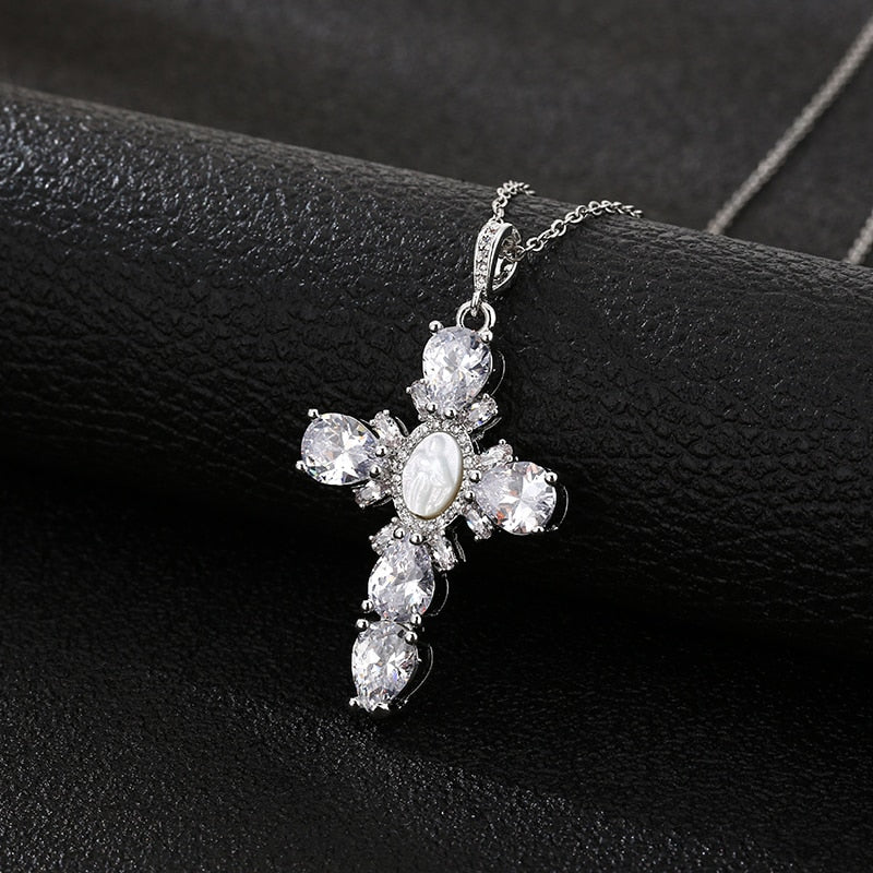 Shell Virgin Mary Cross Crystal Pendant Necklace