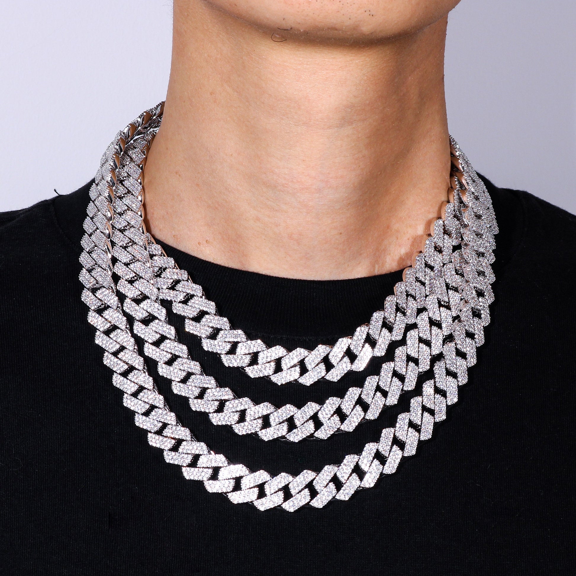 Three-Row Diamond Prong Cuban Link Chain White Gold